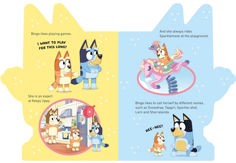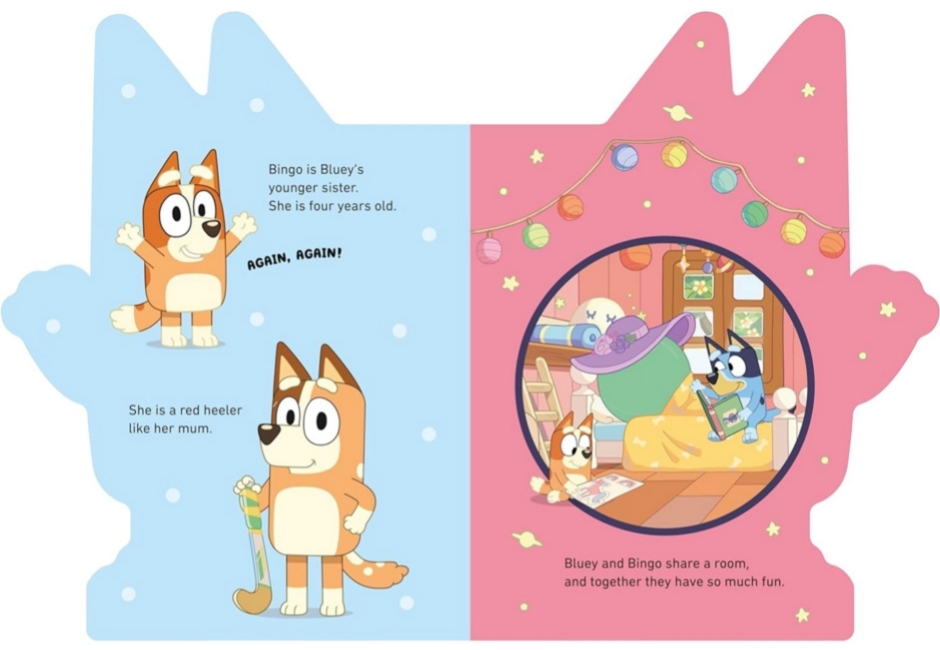 Learn all about Bingo in this fun shaped board book! Bingo loves to sing, learn new things from Bluey, and relax in her relaxer chair. This book is perfect for Bluey fans who want to know more Bingo, her favorite outdoor activities, and what she likes to do before bedtime!