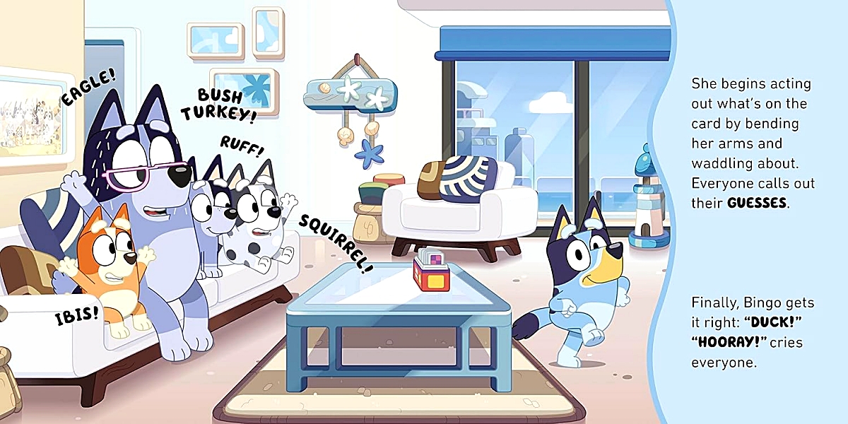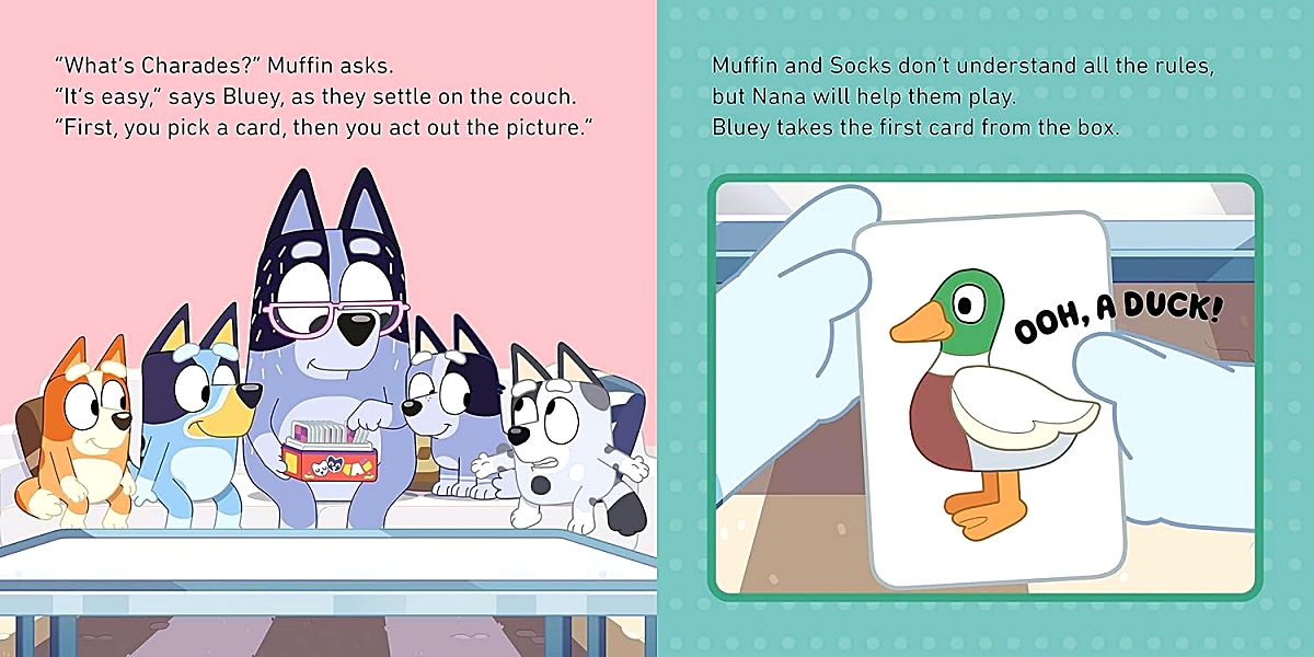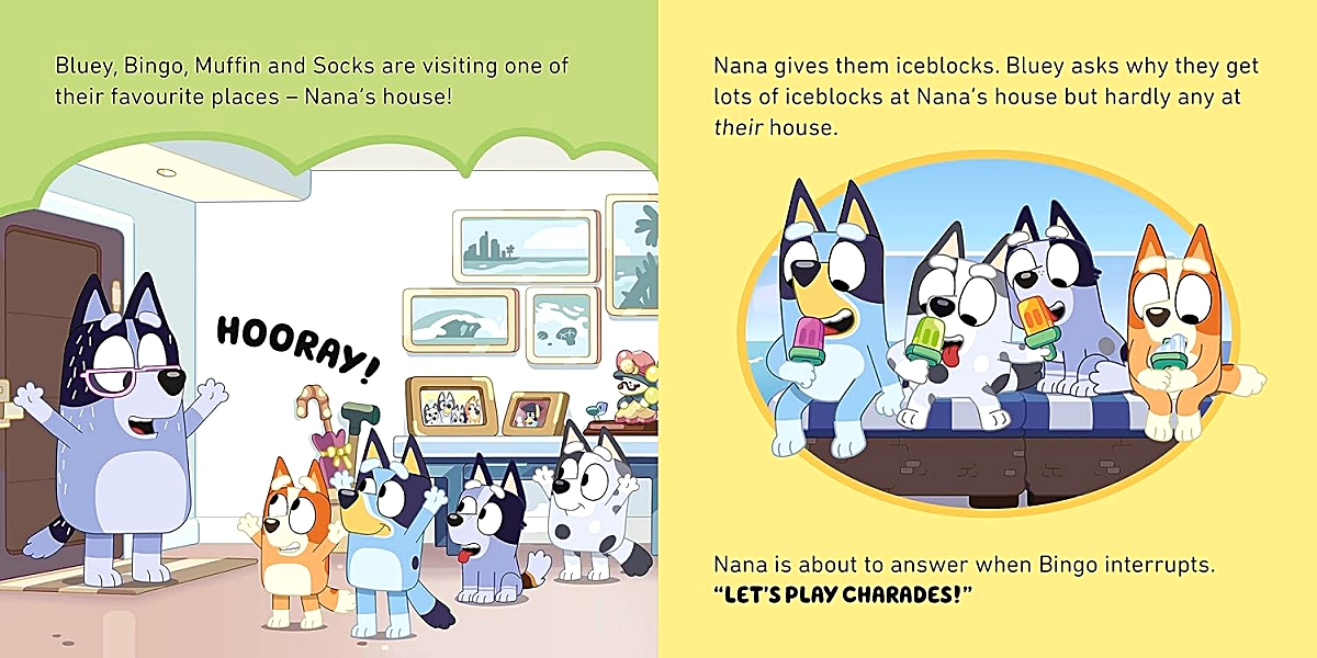 Bluey and Bingo are at Nana's house with Muffin and Socks playing a game of charades. The littlies are having trouble with the rules. Can Bluey and Bingo help them play?